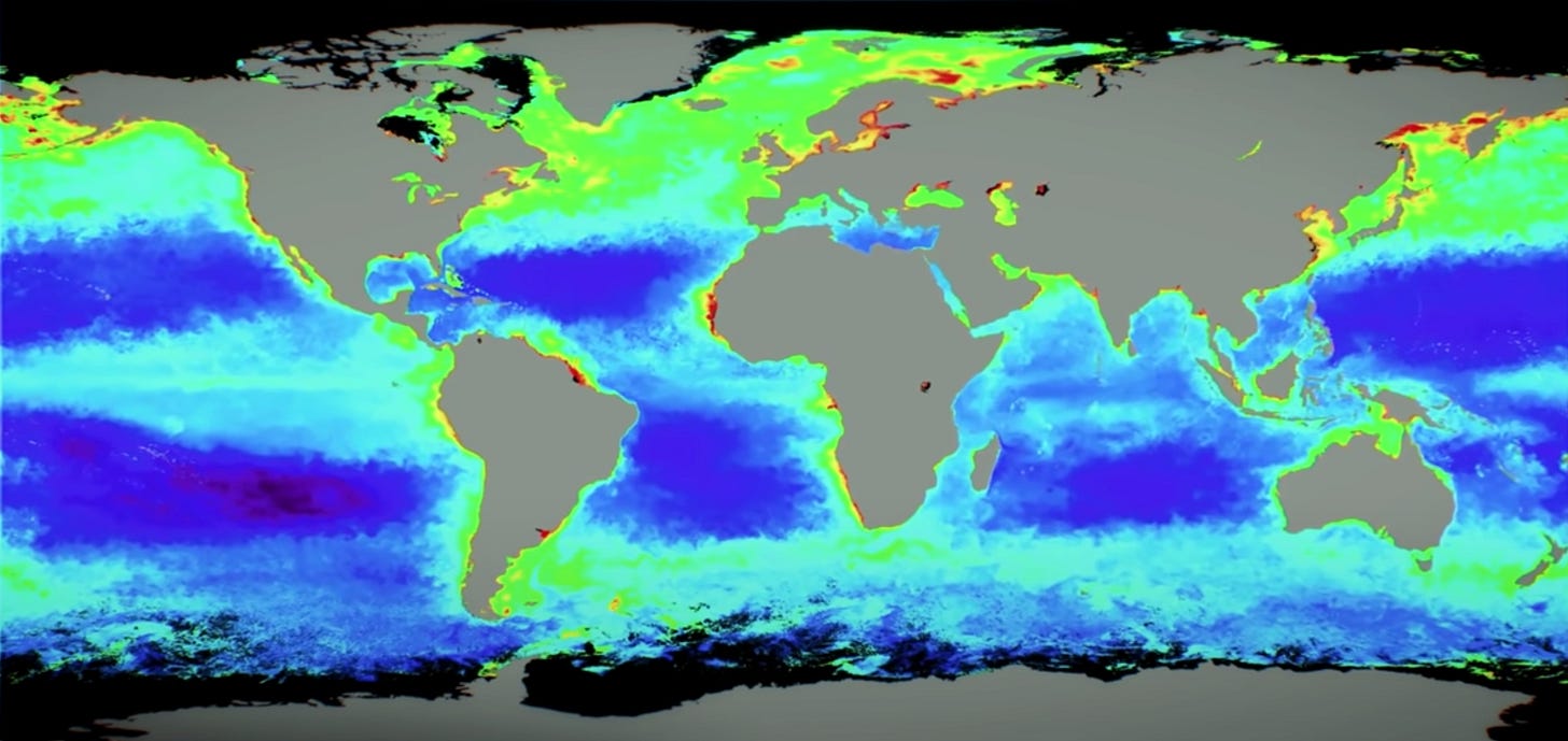This map reveals two important facts about the ocean: First since vital plankton floating in the ocean water are directly dependent on obtaining nutrients from their surroundings, this map by extension shows us where nutrients are present and are not present in the ocean. Second, since primary producers (plankton) constitute the foundation of every ecosystem on Earth, we can take this to mean that where we find greater levels of production, that's consequently where ecosystem complexity and life diversity reside.