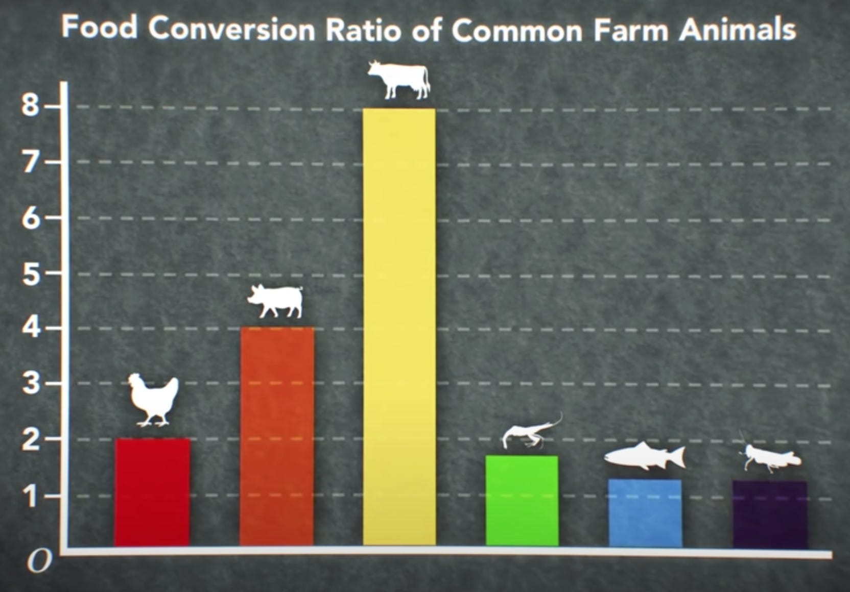 If you look at the food conversion ratios of common farm animals, you will find that it takes a chicken 2 kg of feed to produce 1 kg of the meat. Pigs require 4 kg to build a single kilogram. Ox and cows must take in 8 kg to produce just 1 kg of beef. Your average tropical shrimp, however, has a food conversion of only 1.8 at the shrimps are even better at 1 to 1, making them a more efficient use of feed than any other major livestock in roughly on pair with crickets. But who the hell is eating crickets. This isn't even to mention the true champions of efficiency: shellfish can build up the proteins on their own, just by taking in the microscopic fight on plankton and other organic matter suspended in ocean water, making their food conversion to ratio actually zero. Meaning? Not only is there no threat of pollution from selfish agriculture, but they can literally be grown in near sources of water as a means of cleaning water and fighting against eutrophication.