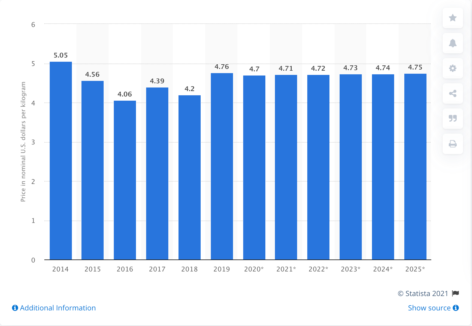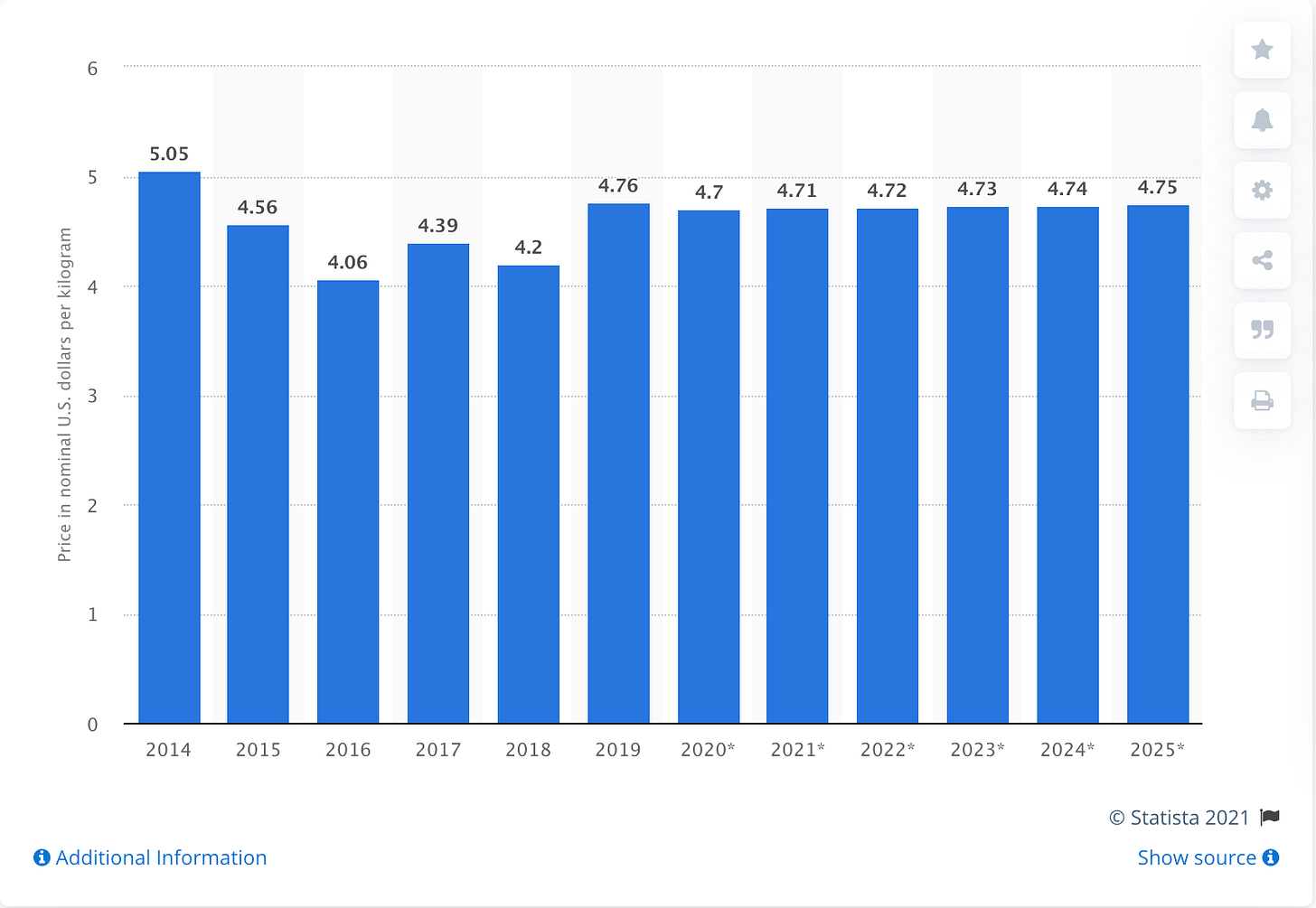 The graph above illustrates the average prices of beef per kilogram (in USD) worldwide from 2014 to 2025. We see that the year 2014 had the highest price and has seen a decreasing trend overall; however, it started increasing again in the year 2019 and will remain relatively stable till 2025. Sure, we see that the price dropped from 2014, but there are cons associated with such. One thing we know for sure is that ordinary vegetables (excluding premium organic vegetables) are much cheaper compared to meat, so meat can still be deemed as an expensive commodity in the market. In addition, there has been inflation throughout the years, causing meat prices to increase from last year by approximately 3.3% for beef and veal. Due to the pandemic, a lot of people are encouraged to stay home. In turn, employed people working from home have substantially more disposable income, earning more money to purchase those meats. Demand for meats went up approximately 2% from last year, and this year alone, it went up by 5.7%
