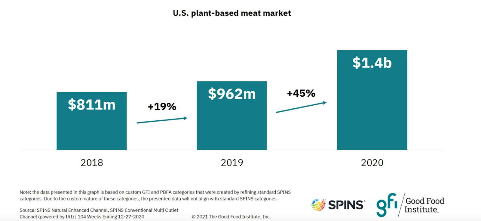 Based on the graph, we see that in 2019, the market value for the plant-based meat market worldwide stands at $11.1 billion, and will continue to rise throughout the years. By 2027, itâs expected to reach approximately $35.5 billion, over triple what it was 8 years ago! Seeing this as a great opportunity a lot of businesses have jumped into this market. Another graph shows how the value of the market has increased throughout the years 2018-2020. Between 2018-2019, the value jumped up by 19% whereas between 2019-2020, it jumped up by 45%! Not to mention, in the US, 98% of the people who purchase plant-based meat also purchase conventional meat, The tremendous increase in growth truly proves the marketâs promising future.