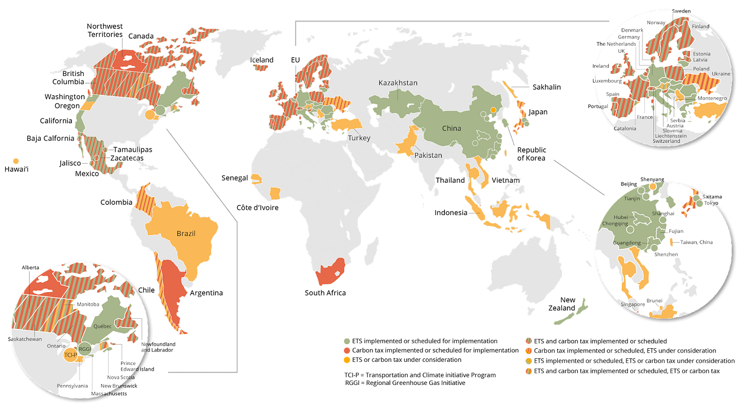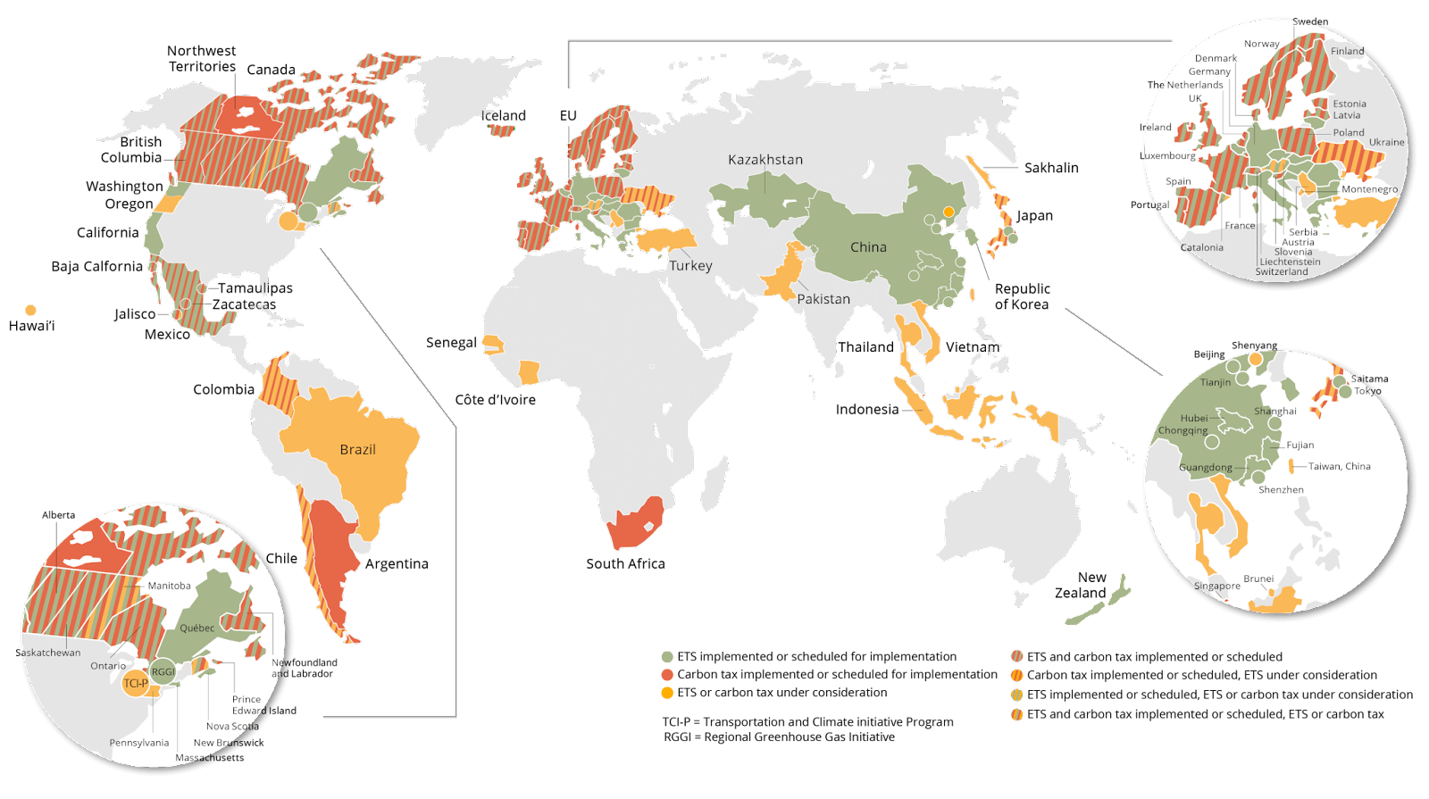The biggest problem in economics is “externalities”. Externalities are consequences of actions that are not factored into the cost. An example is carbon emissions from a factory that harms the whole community. A carbon tax is one way to deal with the externality of carbon produced by companies. It is also a way to achieve net-zero emission in 2050. Carbon tax, which also applies to other greenhouse gases, is levied on carbon from fossil fuels consumption and industrial operations that a company is involved in. Currently, there are two schemes for carbon pricing: a carbon tax and Emissions Trading Schemes (ETS). Some countries have both carbon tax and ETS schemes in place such as Sweden while others only have one as shown in the map below. A carbon tax is a tax put on emissions one company produces. Thus, the company can produce any amount of emissions as long as it is willing to pay for the tax. The UK has a tax of 21 pounds per tonnes of emissions. ETS is a cap-and-trade scheme, which sets the limit on carbon emissions for companies. If companies exceed the limit, they can buy allowances from other companies that do not reach the limit of emissions. The price per tonnes of emissions will be determined by the market. A carbon tax for the EU is 82 Euros per tonnes (as of 20 January 2022), a 50 Euros increase from a year ago. The price is projected to be rapidly increasing due to the net-zero goal set for all companies in 2050. This is a large business opportunity for companies that achieve carbon neutrality first. When that is achieved, companies can sell carbon allocations as well as be at the head of the adoption curve.