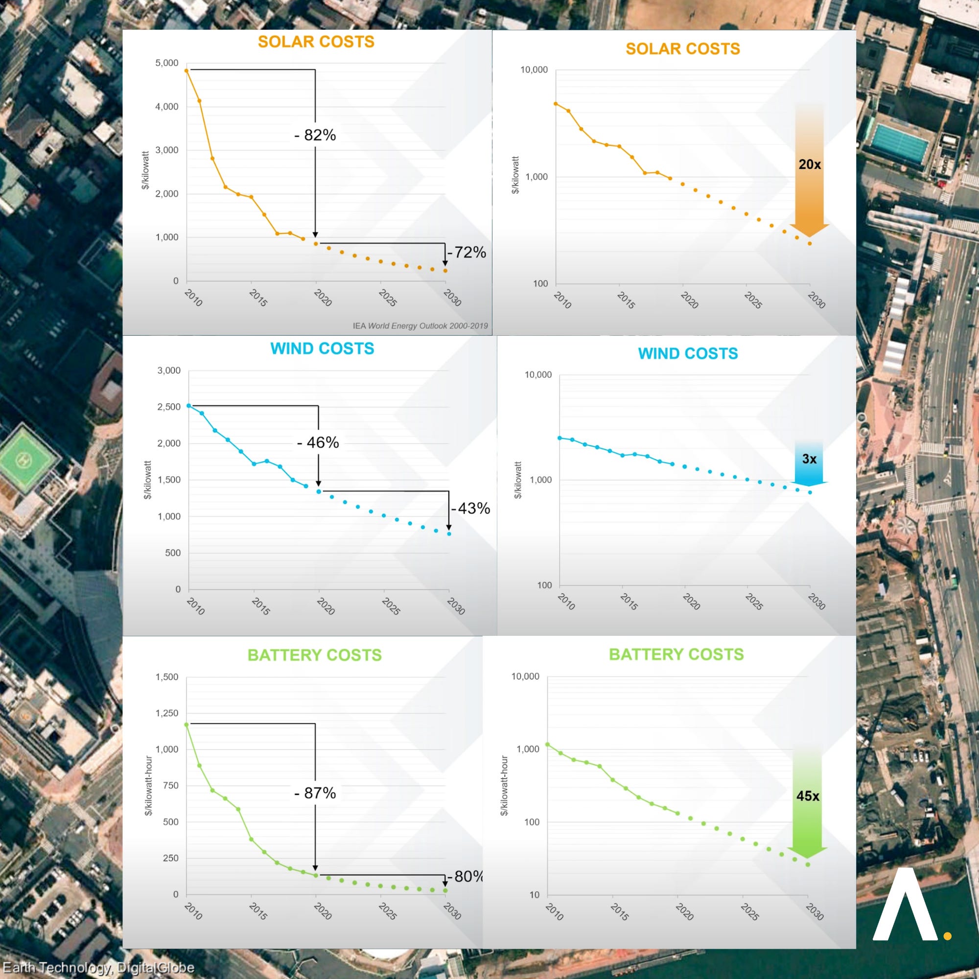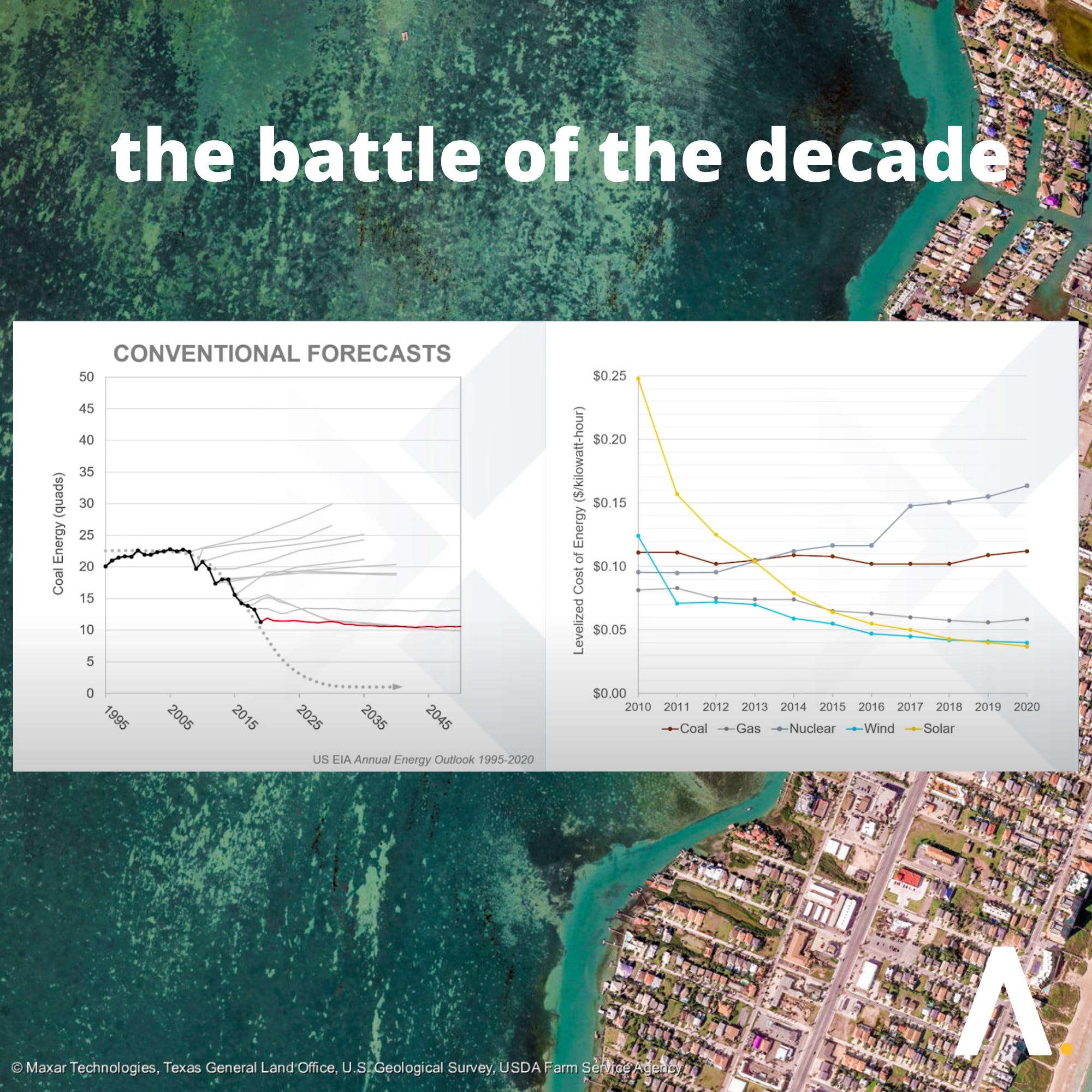 This disruption is the result of a convergence of several key technological improvements: The cost of solar wind and batteries have been improving relentlessly for several decades, and now, the common coal gas and oil technologies can no longer compete. This makes the disruption inevitable, because of economic forces alone.