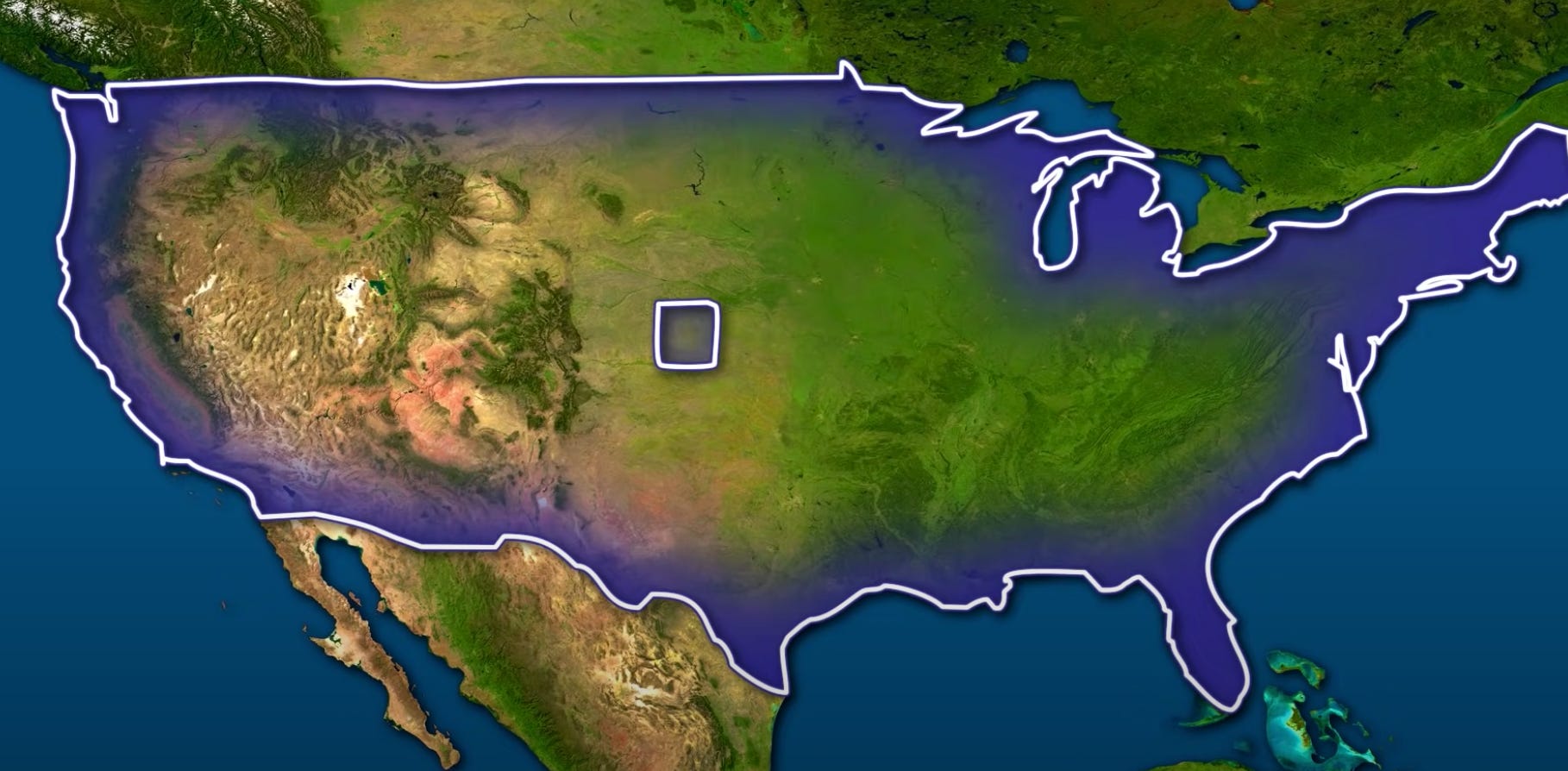 The square on that map is the surface it would take for a giant solar farm feeding the entire USA energy. This sounds like a lot but the USA covers a surface of 2,400,000,000 acres. So this surface required to get the United States completely solar energy powered would require only 0.5% of the country surface area.