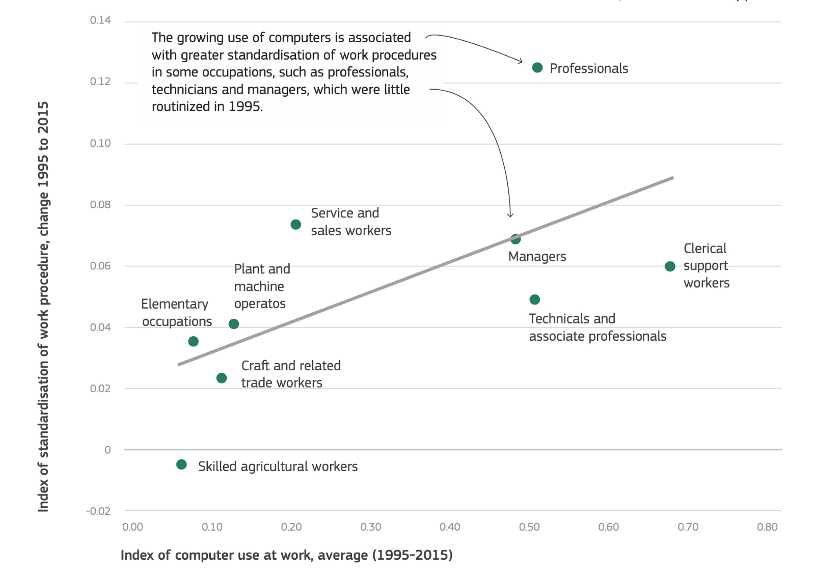 Regardless of whether computers wipe out wide swaths of low-cognitive work, like routine data processing and perfunctory middle management functions, there appears to be broad agreement about what tasks will be left to workers.