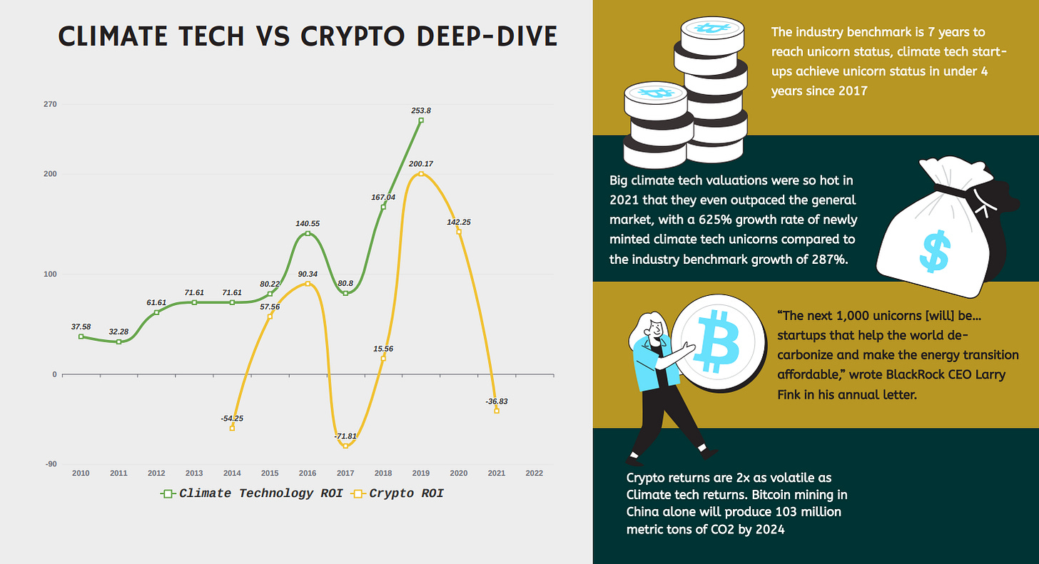 Well recently, lots of wealthy people teamed up with normal people and wagecucks (like me) to put in the air $1.03 trillion US dollars of cryptocurrencies as of Nov. 26, 2021. That’s almost precisely the type of money that has also been invested in companies working on adapting our infrastructures to sustainable energy and regenerating our planet with zero carbon industries. And it seems like the bet has been more profitable for investors of climate tech companies (2368% growth over the period) than for us, cryptobros all combined (21% growth over the period):