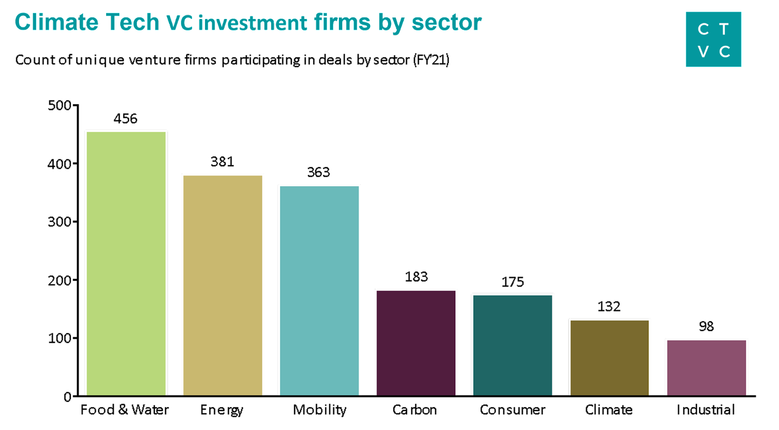 ~1,400 investment firms joined at least 1 climate tech deal in 2021. Food & Water climate deals attracted the greatest diversity of unique participating investment firms. Climate-curious firms participated in many more Energy and Mobility deals compared to the year before, signaling an overall willingness to support B2B and hard tech models. In total, these three sectors accounted for over two-thirds of unique investors’ climate activity. Most notably, more investment firms jumped into the white-hot Carbon sector. 100 additional unique investors backed Carbon deals in just H2’21 for a total of 183 firms participating in carbon removal, offsets, and markets in 2021.