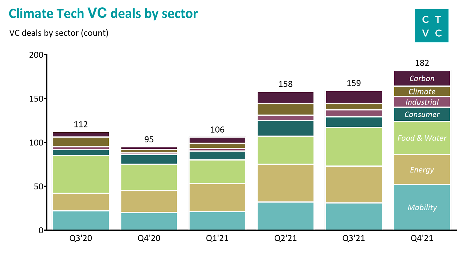 Deal flow boomed alongside deal sizes. 605 climate tech companies got VC funded in 2021. Compared to the same period in 2020, there were ~65% more climate tech deals in H2’21 and ~90% more in Q4’21. Like funding, the count of deals increased sequentially each quarter of 2021.
