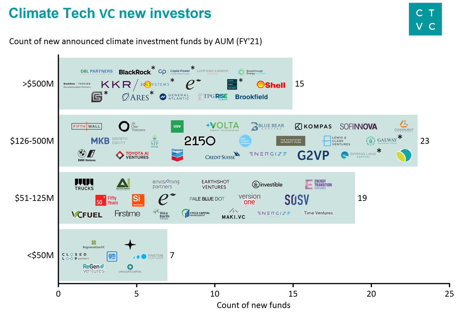 When tracking announcements of new climate funds, we looked at the full stack of financing options, including both VC/ PE as well as infra funds (marked with an * in the chart above). 64 new climate funds launched in 2021 with $37b of fresh dry powder ready to plow into climate tech. 2/3rds of new entrants are mid-to-large funds with $51-500m AUM. But the lion’s share of new climate cash ($30b) comes from the 15 new megafunds, each with $500m+ AUM.
