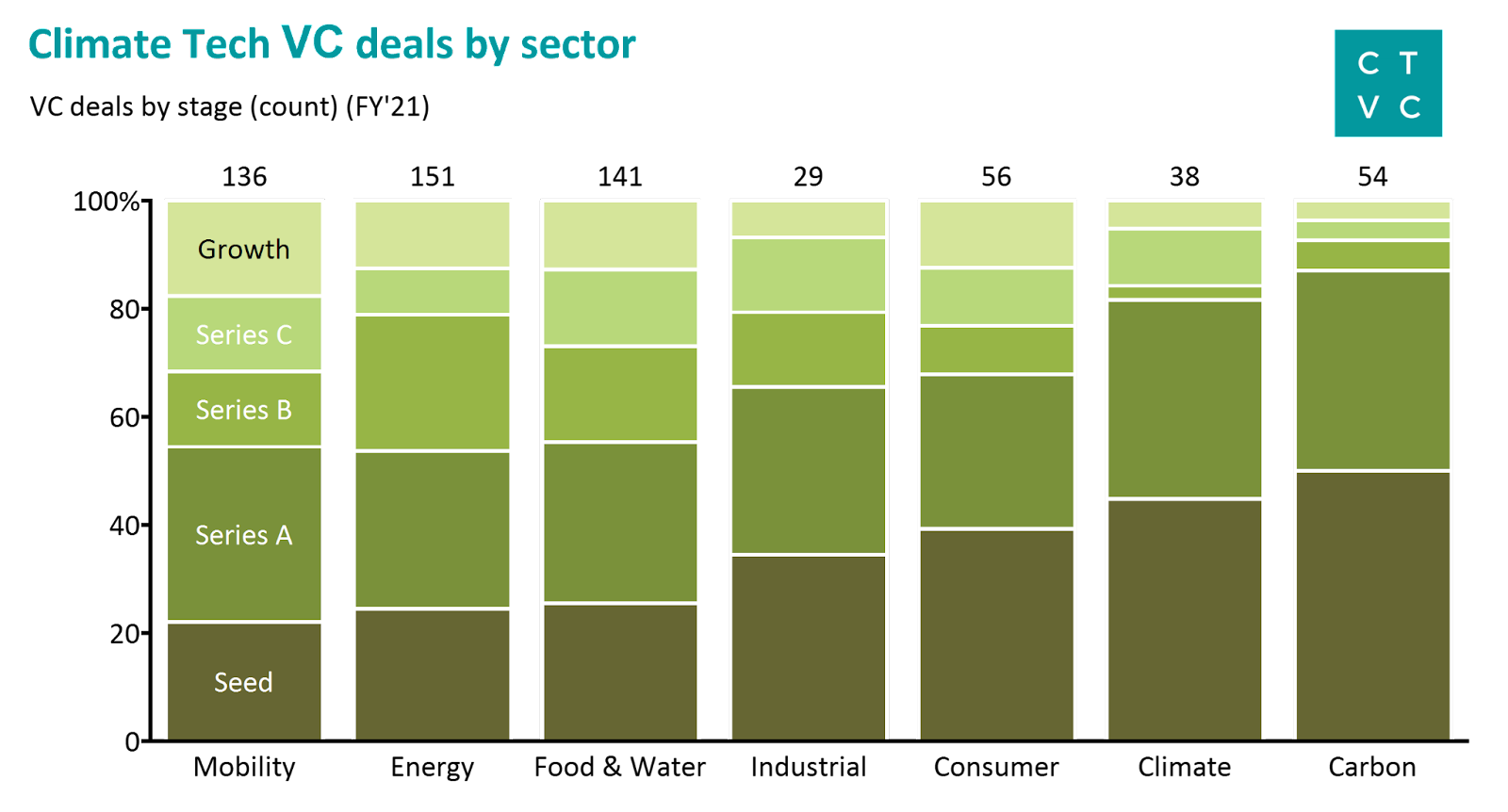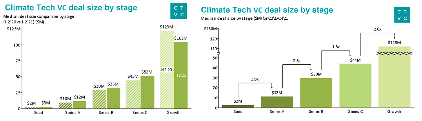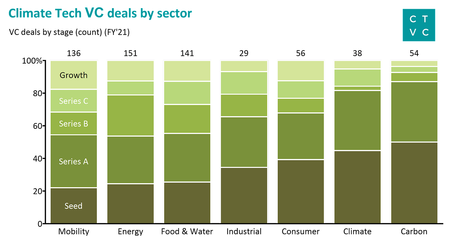 Deal stage distributions reveal the relative maturity of various climate tech sectors. Within Mobility, Energy, Food & Water, late-stage deals (Series B+) make up 40% of deal count activity. These 3 sectors have a prior cohort of businesses founded in the early 2010s that are now maturing. Meanwhile, in the emerging sectors of Carbon and Climate, early-stage activity (Seed and Series A) made up 80% of the deal count as new businesses were christened. As the new cohort of climate startups established over the past <5 years mature, we expect to see more late-stage activity. This cohort of successful climate companies will likely be incentivized to rise at a faster velocity, pulled by demand from many new large growth-oriented climate investment funds.