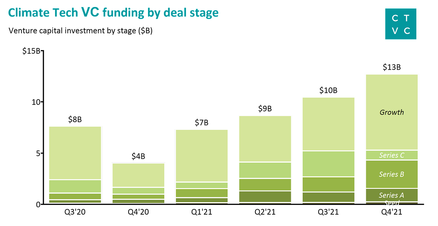 As expected, Growth stage deals continued to account for >50% of all climate dollars in FY’21. In the alphabet soup of pre-Growth venture funding, Series A, B, and C rounds each relatively evenly accounted for 10-20% of all climate tech funding. Though, Commonwealth Fusion’s blockbuster $1.8b Series B (putting the $B in Series B!) round boosted Series B’s representation in Q4’21.